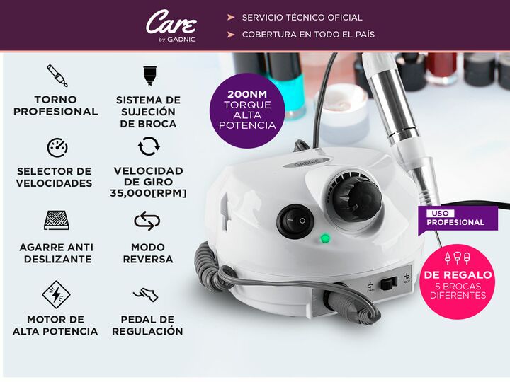 ¡Nuevo Kit Completo de Manicura Profesional Gadnic! Este combo es ideal para quienes buscan un kit completo y profesional para el cuidado de uñas. Torno para Uñas El torno para uñas Gadnic destaca por su potencia de hasta 20,000 RPM, siendo perfecto para trabajar con uñas de gel, acrílicas y natural...