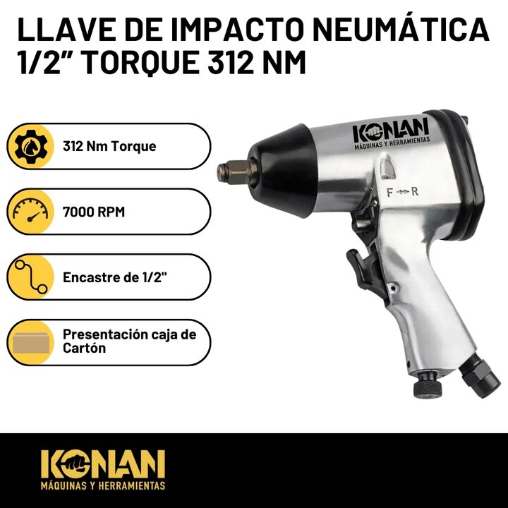 La llave de impacto neumática Konan KLI/01 es una herramienta potente, confiable y diseñada para trabajos exigentes, ideal para mecánica automotriz, mantenimiento industrial, montaje y otras tareas donde necesitas fuerza y rapidez al apretar o aflojar tuercas y tornillos. Gracias a su funcionamiento...