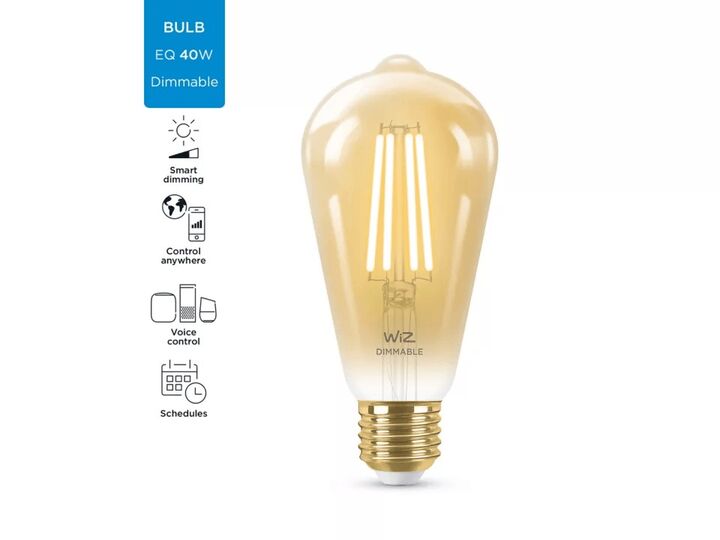 LAMPARA WIZ WIFI FILAMENTO EDISON ST64E27 LED 6.9W 640LmDisfruta de mayor comodidad en tu vida cotidiana con esta lmparaampolleta inteligente de filamento con forma Edison ST64 LED WiZ. Esta lmparaampolleta proporciona una luz blanca suave que se atena al nivel de brillo deseado a travs de la aplica...