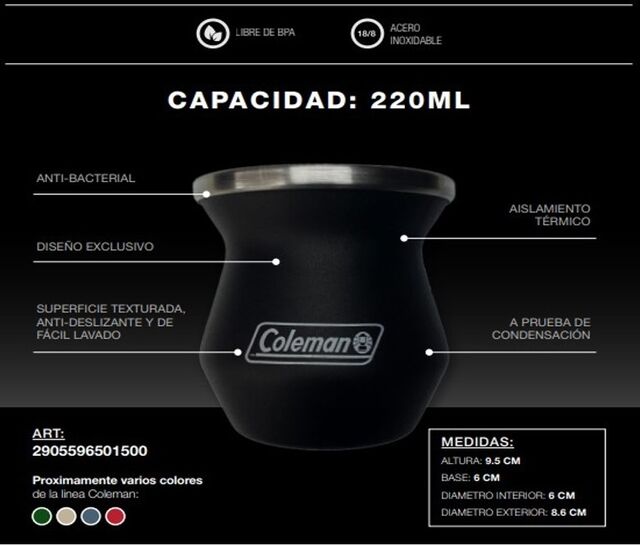 Mate Trmico Coleman Acero Inoxidable 220ml Black Sand -Superficie texturizada anti-deslizante y de fcil lavado. -Capacidad 220 ml. -Mantiene 30 minutos el agua caliente. -Mantiene por 3 hs la bebida fra. -Construido en acero inoxidable con aislamiento al vaco 188. -Libre de BPA.