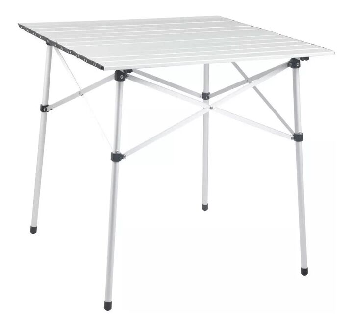 Mesa de aluminio plegable Waterdog - TA-559.-Medida 70 x 70 x 70cm.-Material Estructura de aluminio 19mm. -Tablero superior de listones de aluminio enrollable. -Capacidad de resistencia 30kg.