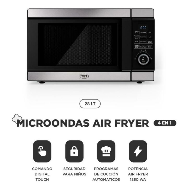 El TST Air Fryer 4 en 1 combina en un solo equipo la practicidad de un microondas la coccin saludable de una air fryer la potencia de un grill y la versatilidad del modo combinado. Ideal para quienes buscan optimizar espacio y sumar funcionalidad en la cocina.Cuenta con comando digital 10 programas ...