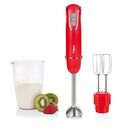 Ideal para preparar salsas licuados pur dips cremas y sopas.Se convierte en batidora manual. Doble batidor de acero inoxidable. Varilla licuadora y emulsionadora de acero inoxidable. Se convierte en batidora manual. Vaso medidor de 600cm. 2 velocidades. Potencia 450 watts. Color Rojo.