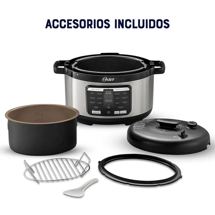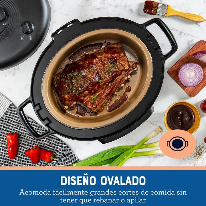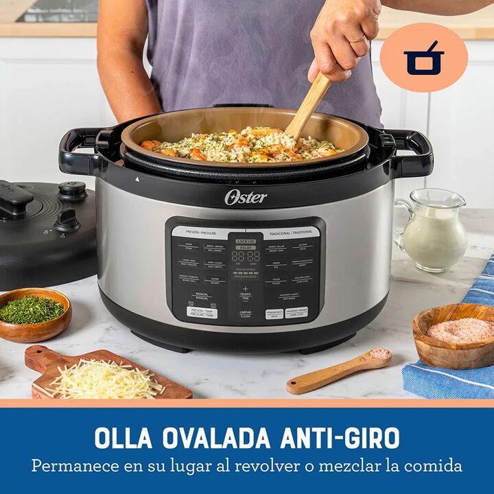 DISEÑO OVALADO PARA UNA MEJOR EXPERIENCIA EN LA COCINA ¡La Multi-olla ovalada Oster® con recubrimiento Bioceramic™ con infusión de aceite de oliva, aporta aún más versatilidad a tu olla a presión! No solo puedes cocinar hasta un 70% más rápido, sino que ahora, con el diseño ovalado, puedes colocar g...