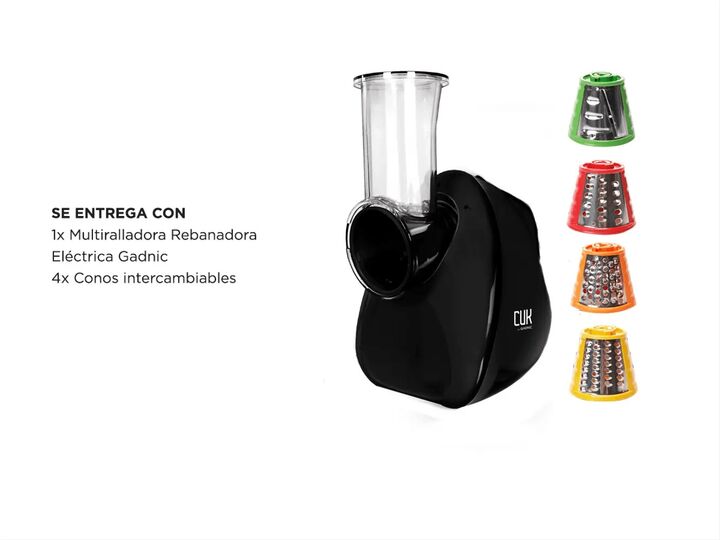 Presentamos nuestra nueva Multiralladora Rebanadora Electrica Cuk By GadnicEquipada con un potente motor de 150 W corte pique ralle o triture instantaneamente sus ingredientes favoritos incluso haga migas de pan y galletas haga que su preparacion de alimentos sea mas rapida. Solo coloque el cono de ...