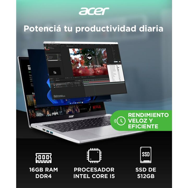 Rendimiento potente y eficiente: Equipado con procesador Intel Core i5-1235U y 16GB de RAM DDR4 para una experiencia fluida en multitarea y aplicaciones exigentes. Almacenamiento veloz y amplio: Disfrutá de 512GB SSD que ofrecen tiempos de carga rápidos y espacio suficiente para tus archivos y progr...