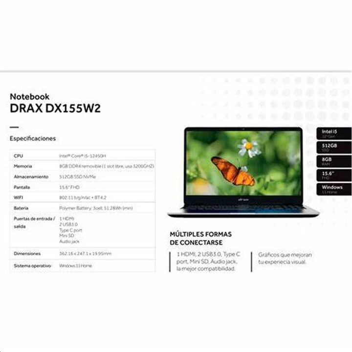 Not Drax Dx155w Ci5|8gb|ssd256|w11 Home PROCESADOR INTEL CORE I5-1155G7 8GB DDR4 3200ghz (soporta 1 modulo mas de 16gb) ALMACENAMIENTO 256GB SSD M.2. TECLADO RETROILUMINADO PANTALLA 15.6 FHD WINDOWS 11 HOME GARANTIA 12 MESES