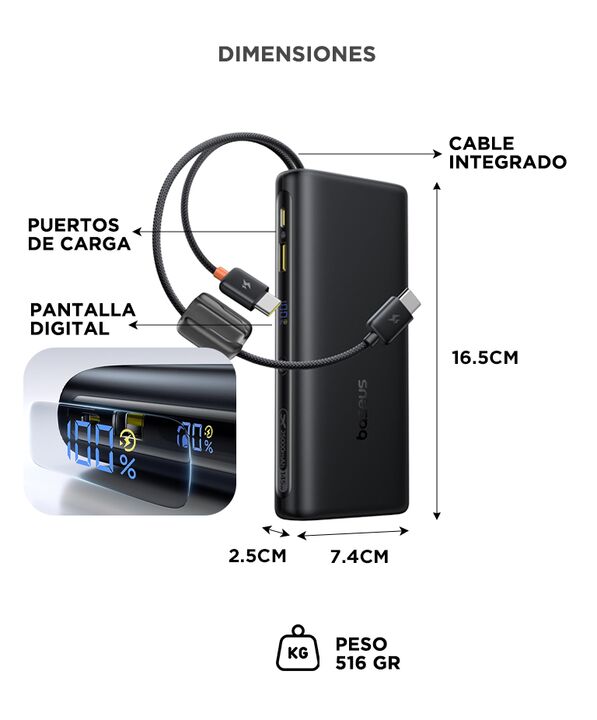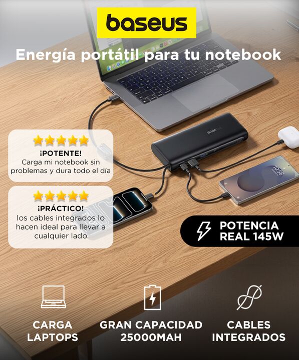 Potencia suficiente para cargar notebooks modernas El cargador portátil Baseus EnerFill 145W permite alimentar notebooks, tablets y smartphones desde un solo dispositivo. Su potencia elevada lo convierte en una solución práctica para trabajo remoto, viajes o emergencias de batería. Gran capacidad de...