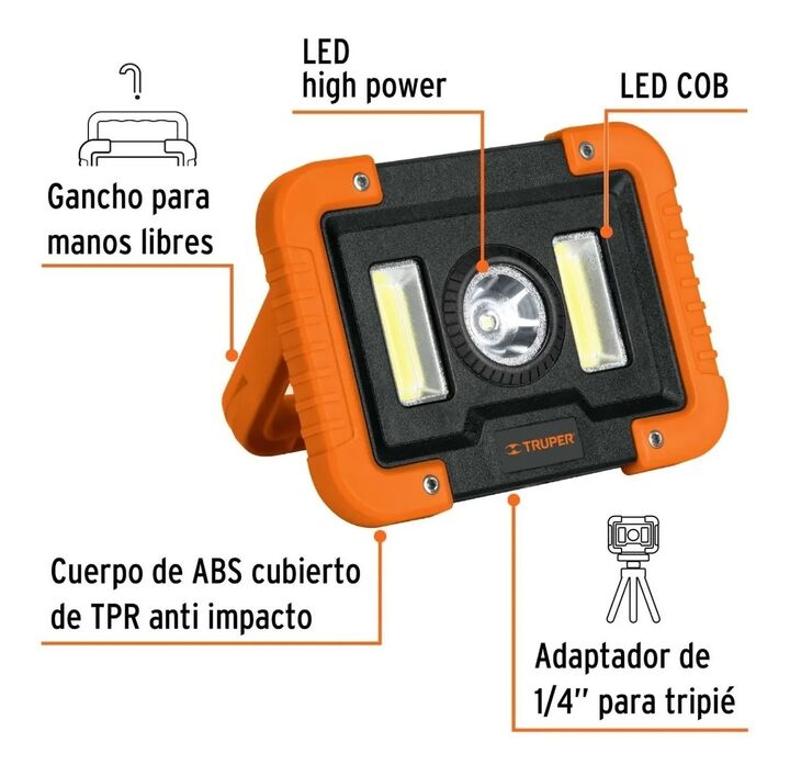 Lmpara LED 1000 lm de trabajo recargable Truper Clave LAT-1300 Distancia del haz de luz 220 m Modos de iluminacin Alto bajo laterales Duracin de carga de la batera 4 horas central 1.5 horas alto 3 horas bajo laterales LED alta luminosidad central LED COB laterales Gancho para uso a manos libres Cum...