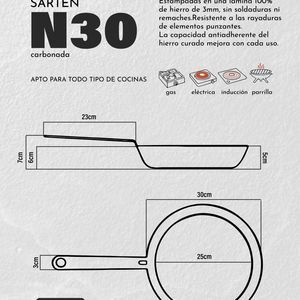La sarten de hierro N30 es nuestra sarten mas grande presenta una superficie de 30 cm de diametro. Es ideal y perfecta para cocinar para grupos grandes. En ella podras realizar cualquier tipo de receta desde jugosas carnes y mariscos hasta verduras salteadas y pastas. La sarte...