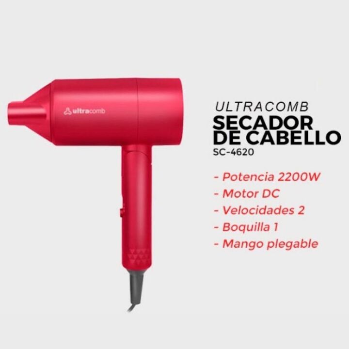 SC 4620 Secador de cabello Ultracomb - Motor DC de 2200W. - 60°C de temperatura constante. - 2 Velocidades/Temperaturas. - 1 Boquilla concentradora. - Protección de contra sobrecalentamiento. - Largo del Cable: 1,8 mts. - Mango Plegable para un fácil transporte. NO MÁS CABELLOS RESECOS O DESFIBRADOS...