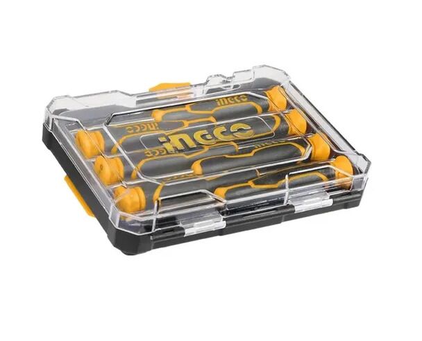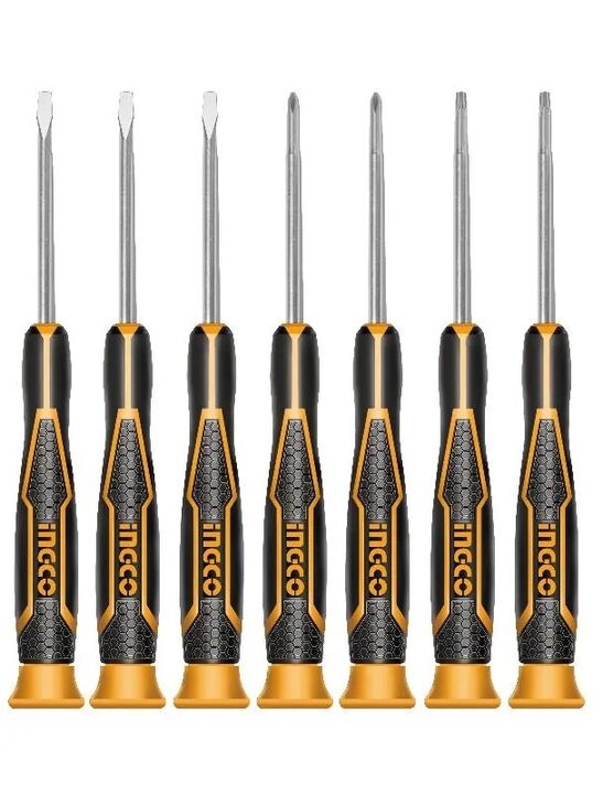 Juego de destornilladores de precision 7pza Nueva manija de diseo INGCO. nueva caja de plastico Incluye SL2.0 50. SL2.5 50. SL3.0 50. PH00 50. PH0 50. T6 50. T8 50 Material CR-V Mango ergonomico y comodo.