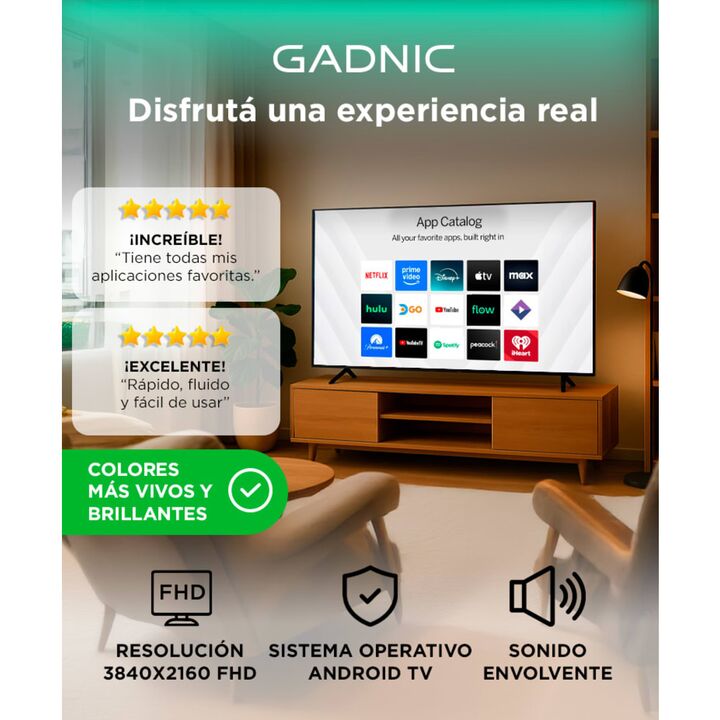Resolución FHD para una experiencia visual inmersiva El Smart TV Gadnic 50” FHD ofrece una calidad de imagen excepcional gracias a su resolución 3840x2160 píxeles y panel CSOT de alto contraste (5000:1). Con un ángulo de visión de 178°, disfrutá de tus series y películas favoritas desde cualquier lu...