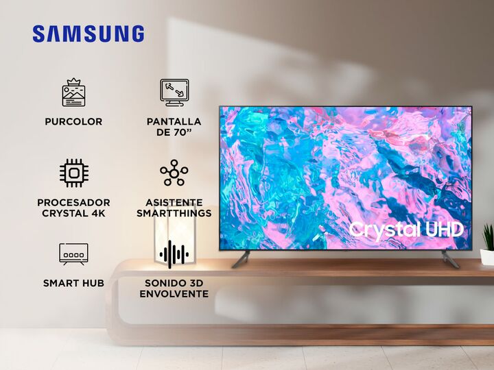Descubrí una nueva forma de disfrutar el entretenimiento con el Smart TV Samsung UHD 4K Serie CU7000 de 70 pulgadas. Gracias a su resolución 4K Ultra HD, cada detalle cobra vida con una claridad sorprendente, mientras que el motor de imágenes Crystal Processor 4K optimiza el contenido en tiempo real...