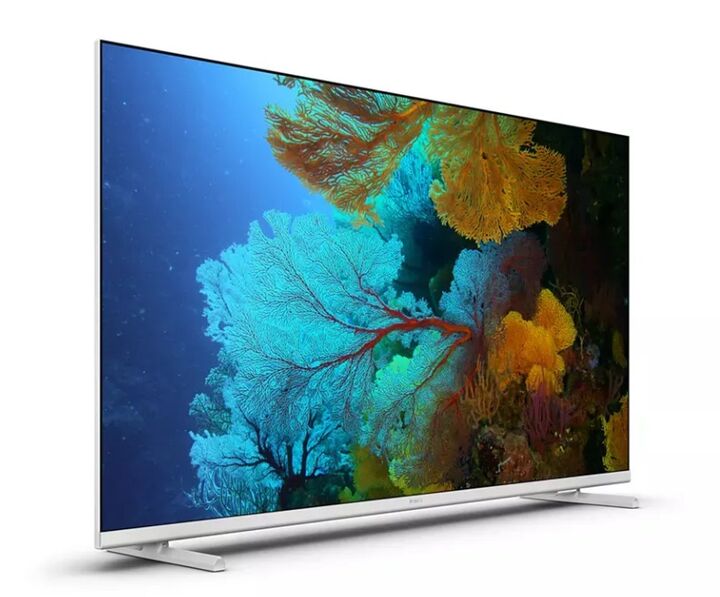 Televisor LED HD Control por voz con el Asistente de Google Admite barras de sonido compatibles con Dolby Atmos Bisel blanco con soporte mate