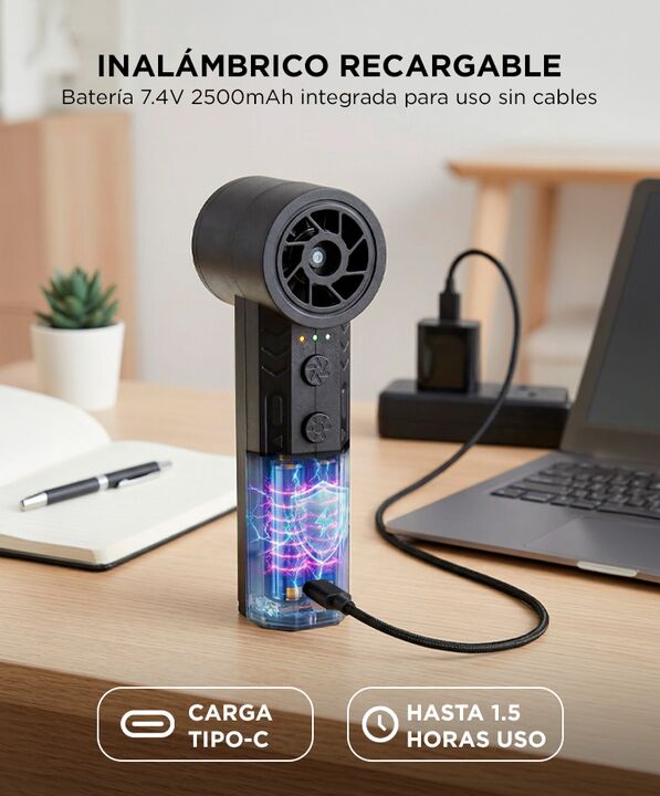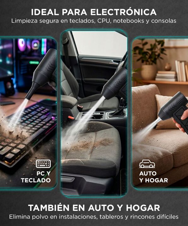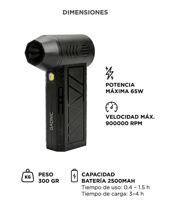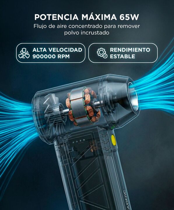 Motor BLDC metálico de alta velocidad: El Limpiador de Aire Comprimido Portátil GADNIC incorpora motor sin escobillas que alcanza hasta 900000 rpm, generando flujo de aire potente y estable para remover polvo acumulado. Potencia real de 65W para limpieza profunda: Su rendimiento permite expulsar par...