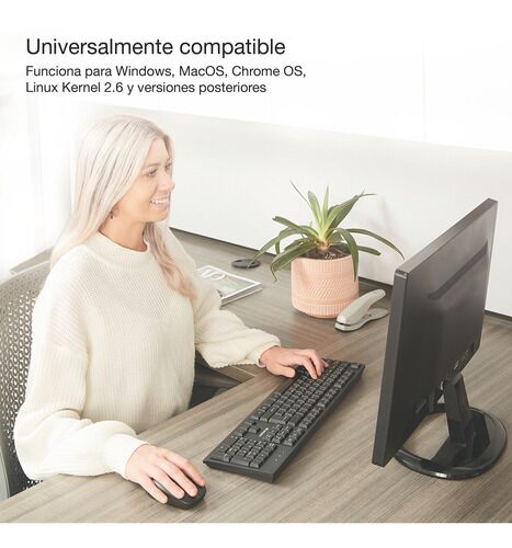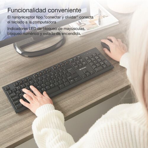 Teclado inalámbrico Verbatim slim receptor USB - 70738 Universalmente compatible Funciona para Windows, MacOS, Chrome OS, Linux Kernel 2.6 y versiones posteriores. Funcionalidad conveniente El nanoreceptor tipo conectar y olvidar conecta el teclado a la computadora Indicadores LED de bloqueo de mayú...