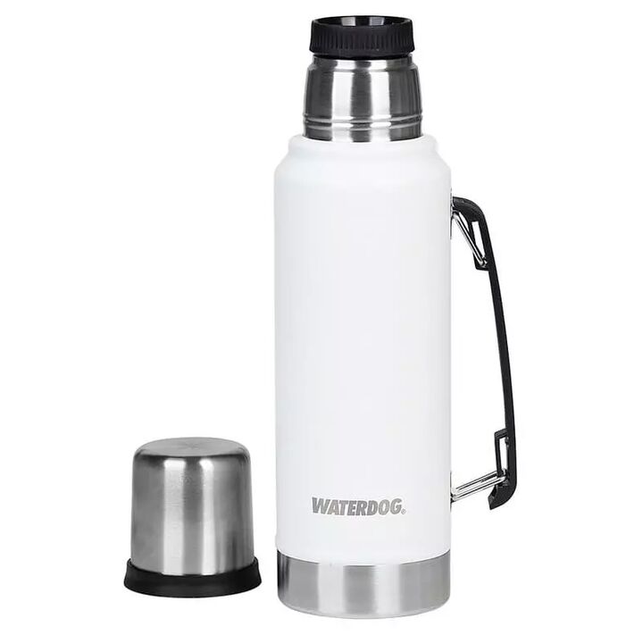 Termo de acero inoxidable de Acero -Capacidad 1000 cc -Con manija de agarre y trasnporte -Doble pared aislante -Recubrimiento powder Coated. -Tapon cebador 360 interior de PP. Modelo OMBU1000WH.