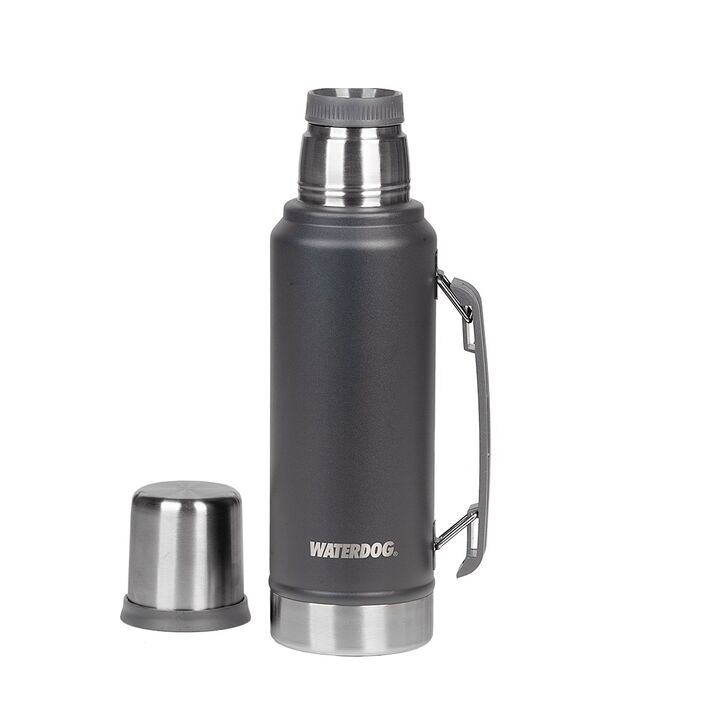 Termo de acero inoxidable de Acero AISI 304Capacidad 1000 ccCon manija de agarre y transporteDoble pared aislanteRecubrimiento powder Coated.Tapn cebador 360 interior de PP.
