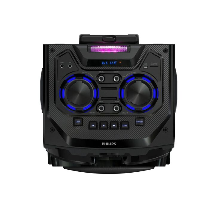 Convertite en el alma de la fiesta con la torre de sonido portátil Bluetooth. El parlante cuenta con funciones de karaoke, luces rítmicas y sonido poderoso con graves potentes. Podes conectarlo a un enchufe o usarlo con la batería integrada cuando estés afuera.