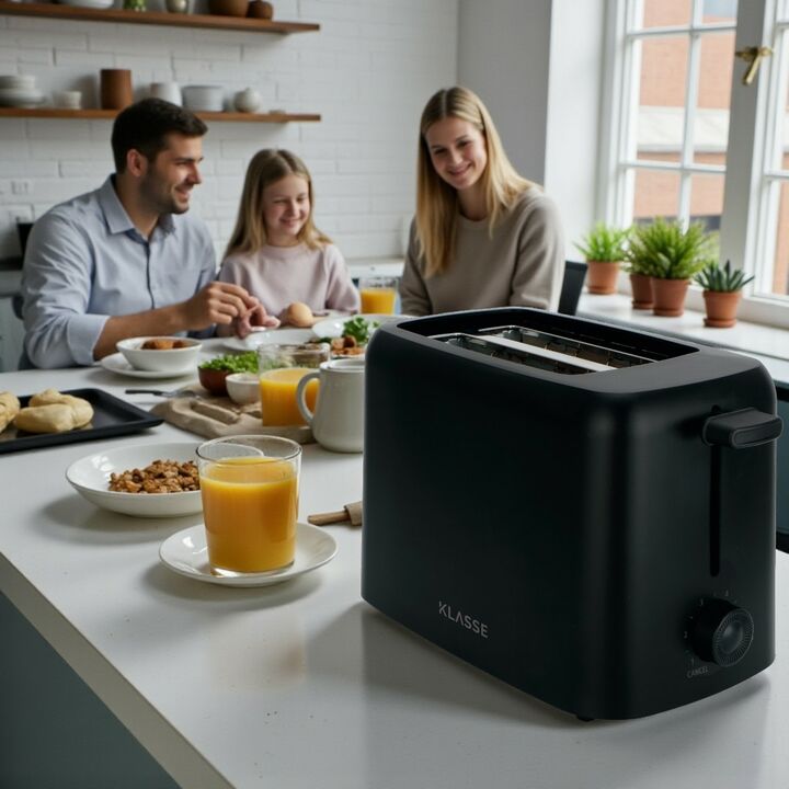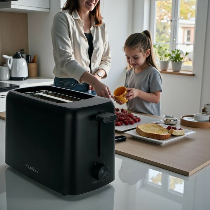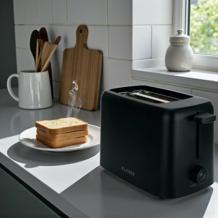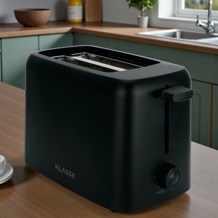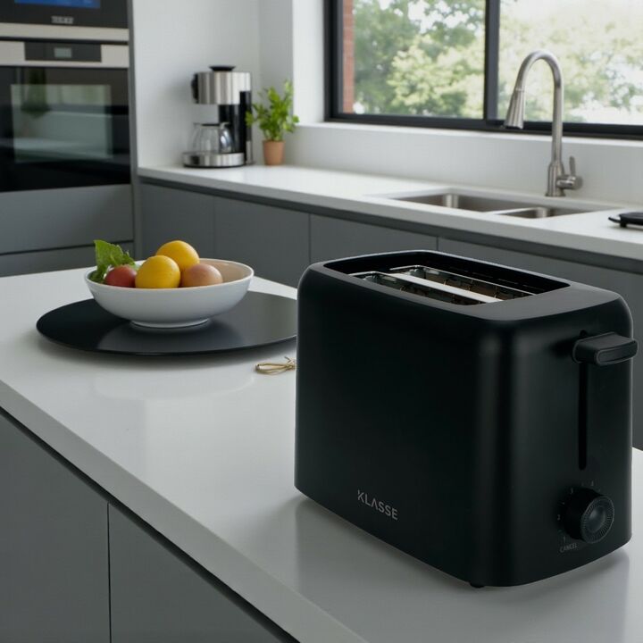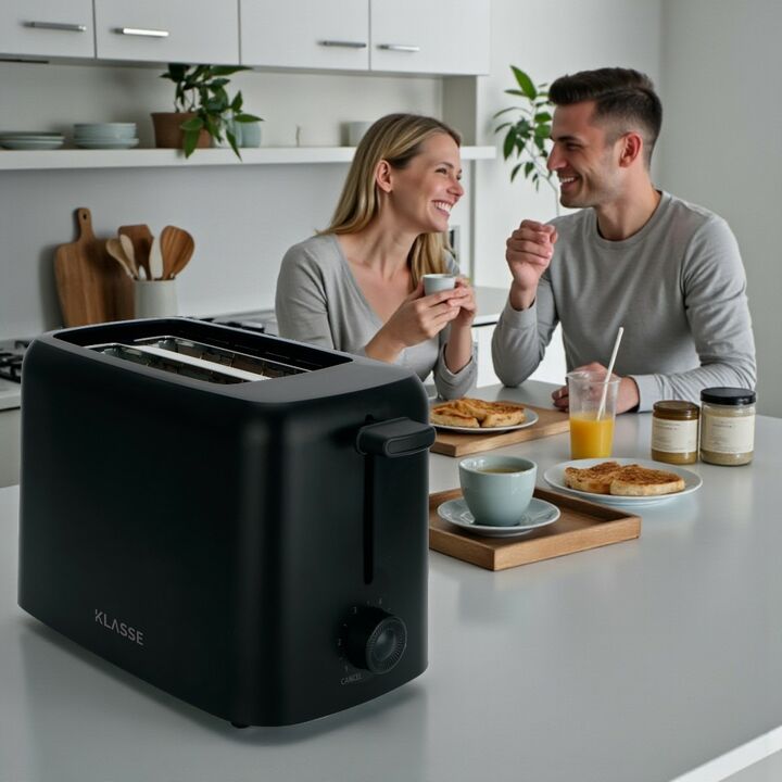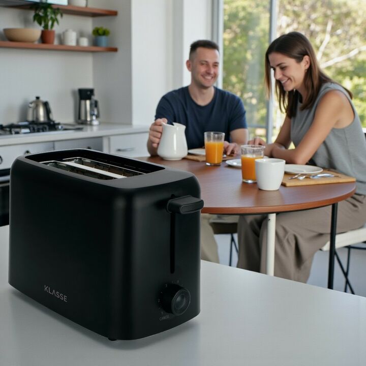 La tostadora KLASSE negra se destaca por su diseño moderno, compacto y resistente, ideal para cocinas contemporáneas. Ofrece 6 niveles de tostado que permiten personalizar el punto exacto de cada tostada, logrando resultados uniformes y precisos.