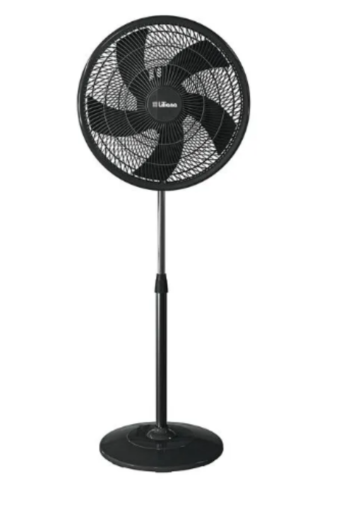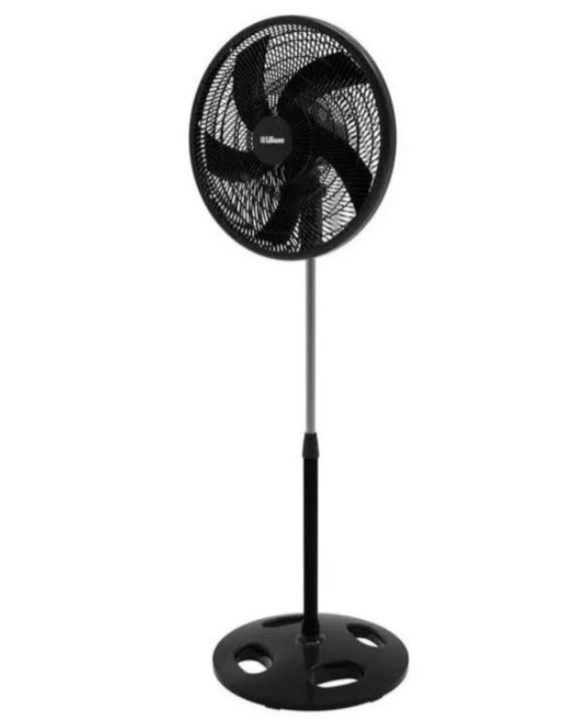 Cabezal oscilante y reclinable · Barral telescópico extensible metálico. Altura máxima 1.50 mts. · 3 velocidades. · 5 aspas negras · Base redonda. · Potencia: 90 watts. · Medidas: 166x56x53 mm. · Diámetro: 20″. Garantía del Fabricante: 24 meses