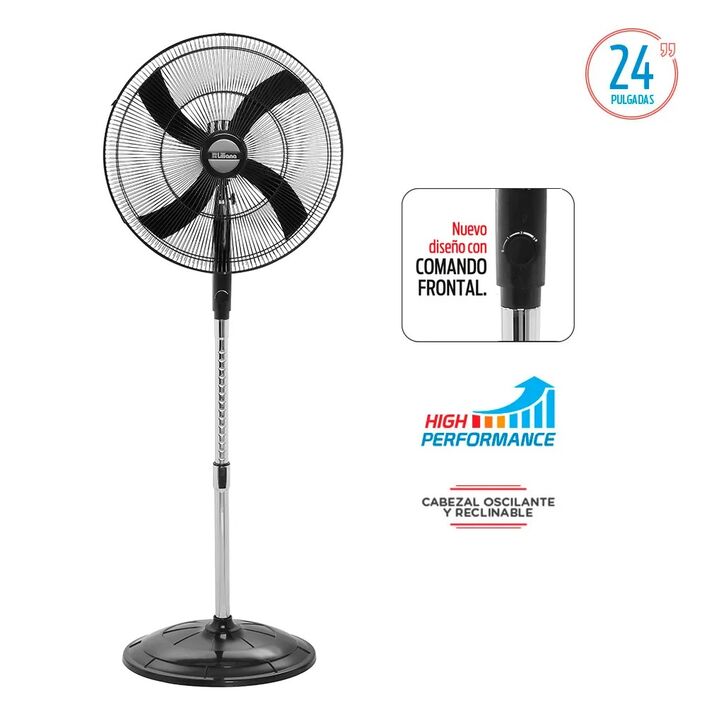 Ventilador de Pie.Motor con doble rodamiento blindado.High Performance.Especial para zonas de altas temperaturas.Comando frontal. Parrilla metlica color negro. Cabezal oscilante y reclinable. 4 aspas negras. Barral extensible con traba de fcil regulacin. Sper silencioso. 3 velocidades. Dimetro de 24...