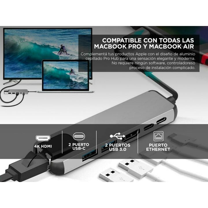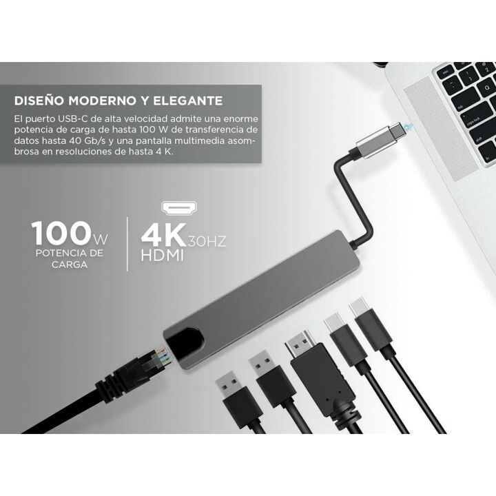 Amplíe los 2 puertos USB-C de su MacBook en 1 puerto Ethernet, 2 puerto de datos USB, 2 puertos Tipo C ,1 puerto HDMI. Todo desde un concentrador ultra compacto. El puerto USB-C de alta velocidad admite una enorme potencia de carga de hasta 100 W de transferencia de datos hasta 40 Gb/s y una pantall...
