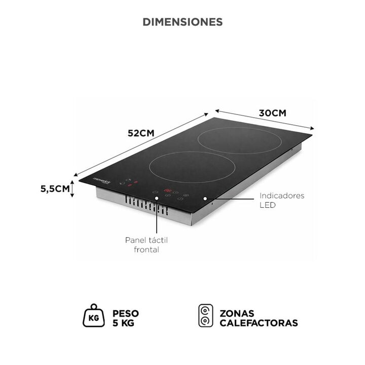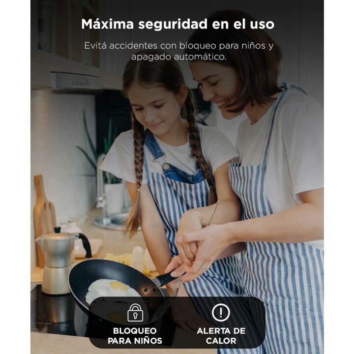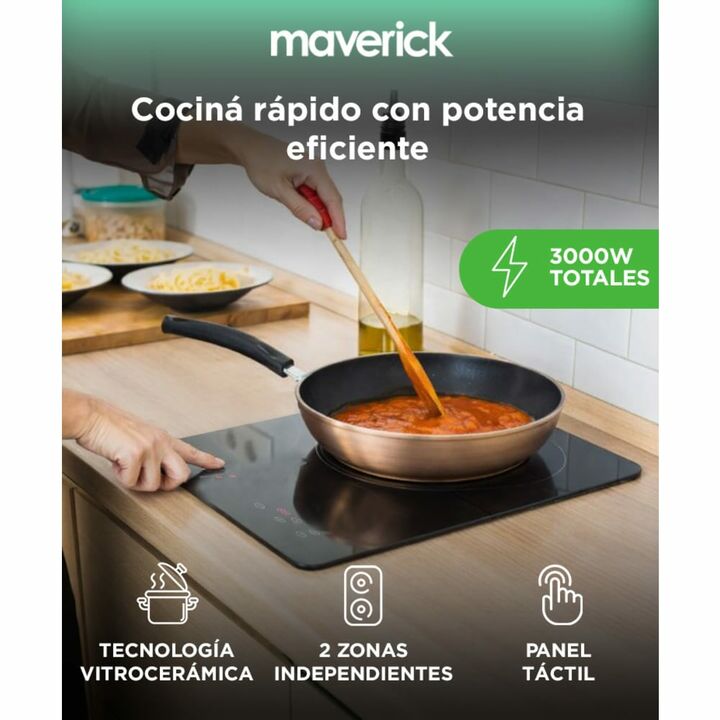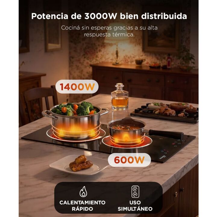 Potencia distribuida para cocinar sin esperas: 3000W totales bien aprovechados en 2 zonas de cocción. Superficie vitrocerámica fácil de limpiar: Diseño elegante y sin uniones para limpieza rápida. Panel táctil intuitivo: Controlá niveles y zonas activas con solo un toque. Seguridad completa: Bloqueo...