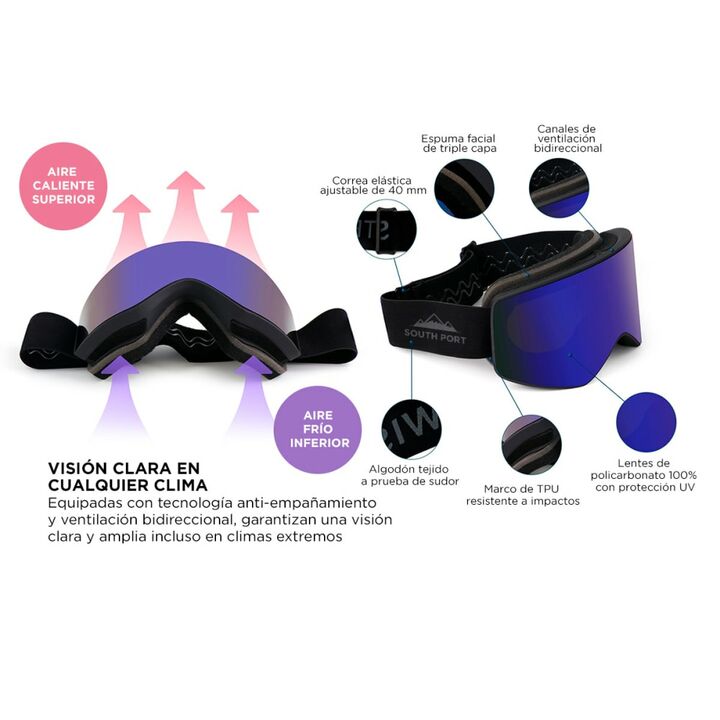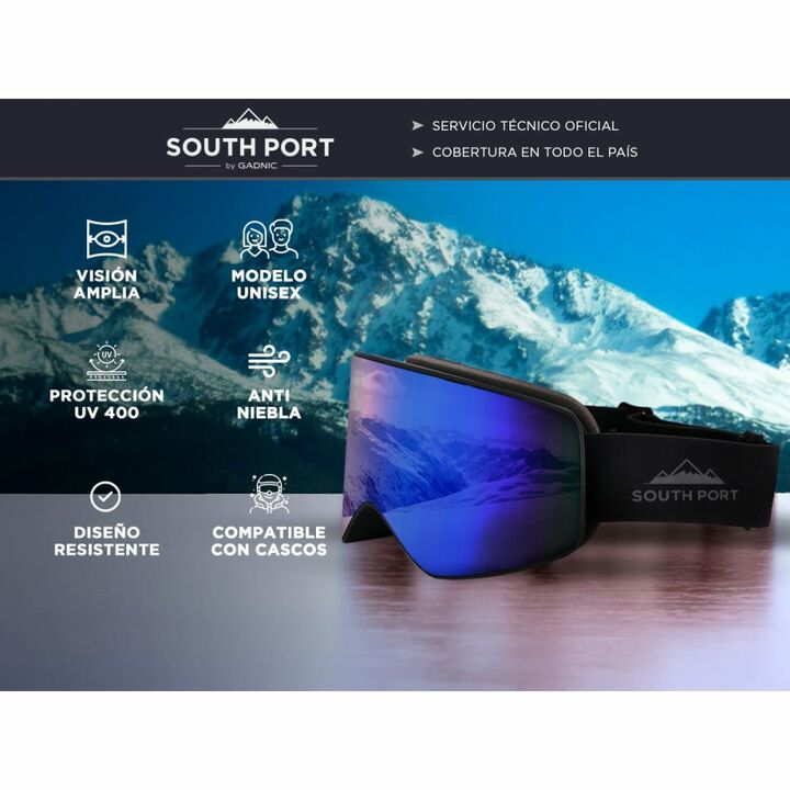 Disfrutá la nieve con estilo y comodidad! Estas antiparras South Port ofrecen visión amplia con protección UV 400 y doble lente anti-niebla. Su diseño ergonómico unisex, compatible con cascos y apto para usar con anteojos, garantiza comodidad para todos. Fabricadas en material TPU liviano y resisten...