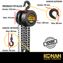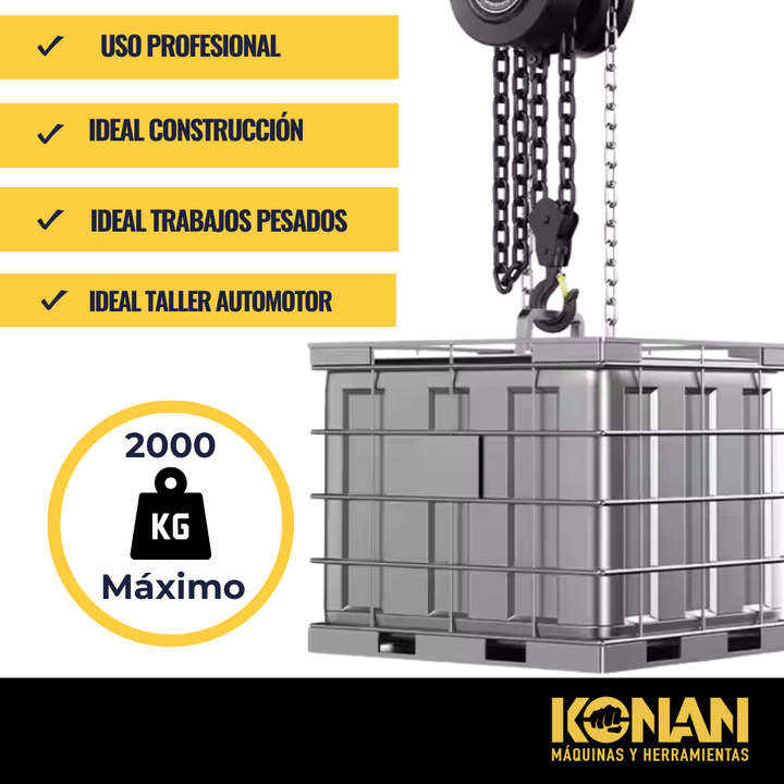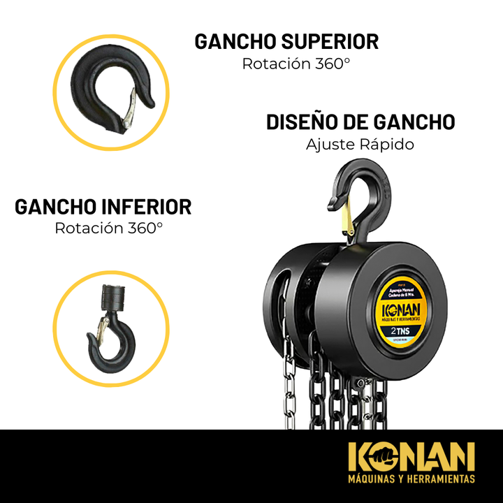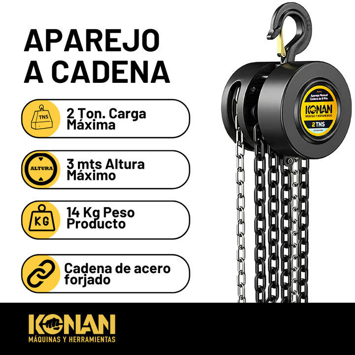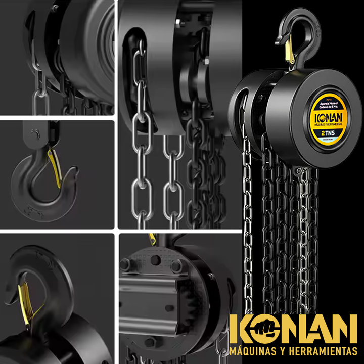 El Aparejo Manual Konan de 2 toneladas con cadena de 3 metros es una herramienta de elevación manual confiable y resistente, diseñada para facilitar trabajos de elevación, descenso y posicionamiento de cargas pesadas sin necesidad de energía eléctrica. Con una capacidad de hasta 2 toneladas (2000 kg...