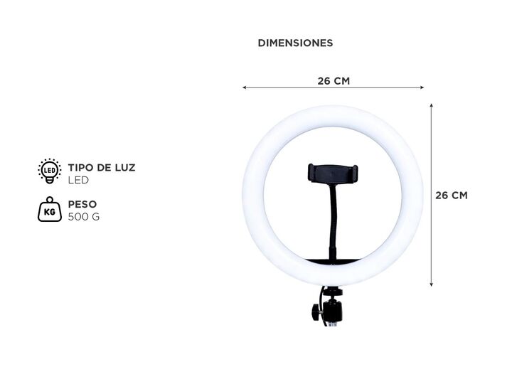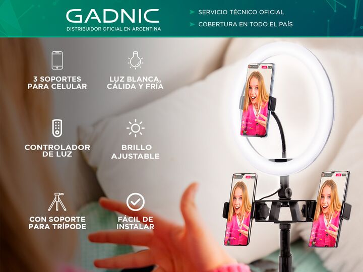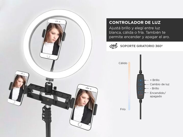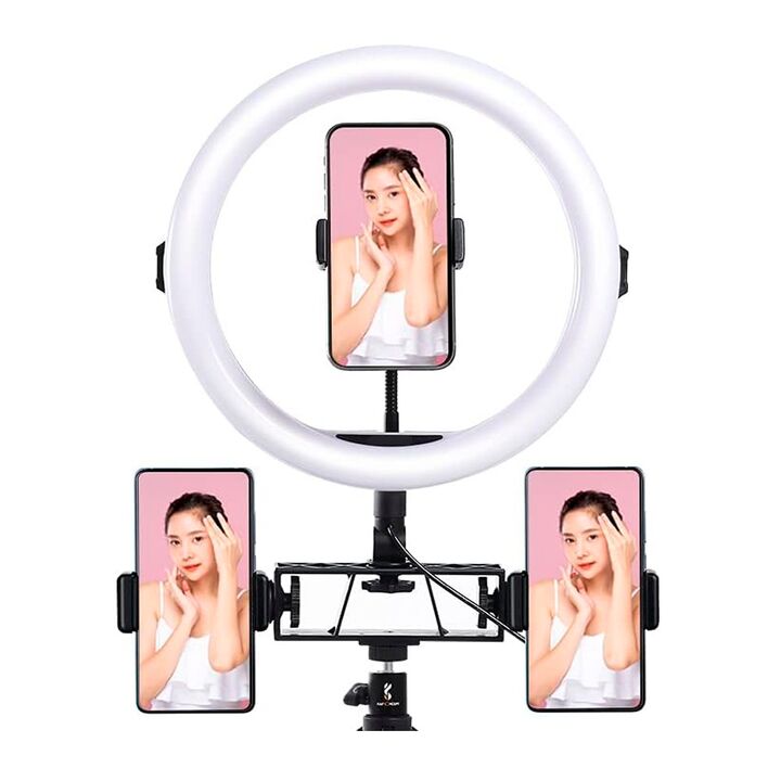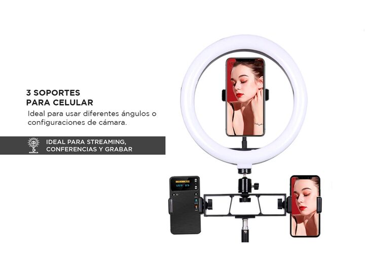 Descubrí el Aro de Luz, tu aliado para iluminar tus fotos, videos y transmisiones en vivo. Equipado con tres soportes ajustables para teléfono, este aro de luz te permite utilizar múltiples dispositivos simultáneamente, brindándote la libertad de cambiar de cámara o ángulo con facilidad y capturar l...