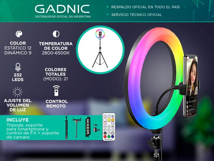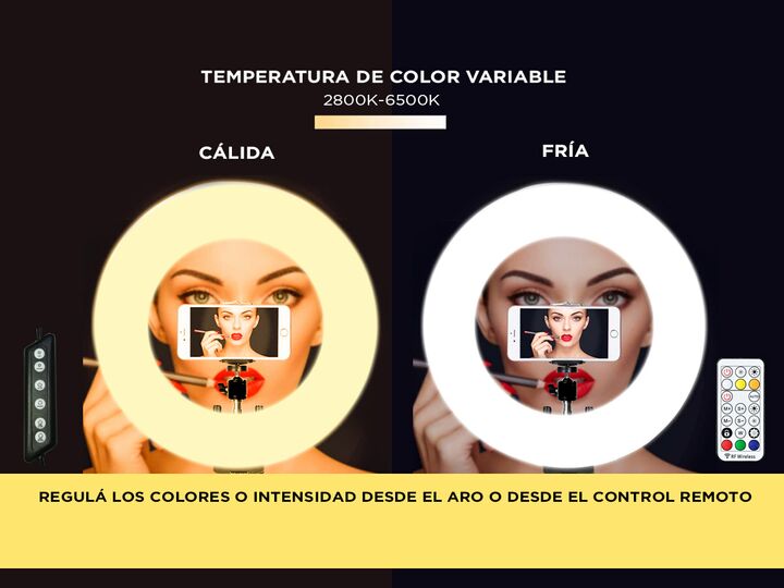Recomendado para uso con smartphone en fotografía de retrato, maquillaje, peluquería, etc. Suaviza el tono de la piel, dejando un cutis terso, creando un efecto profesional de haz luminoso circundante alrededor de los ojos. Pertime crear efecto RGB de Iluminacion para tus videos y fotos. Especificac...
