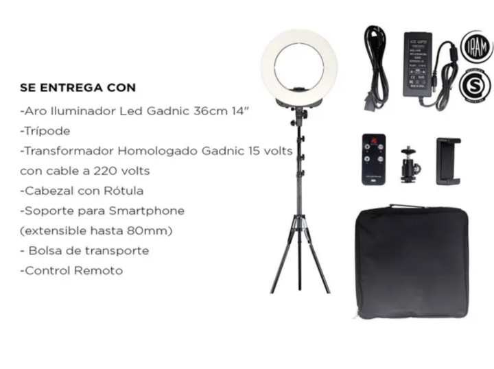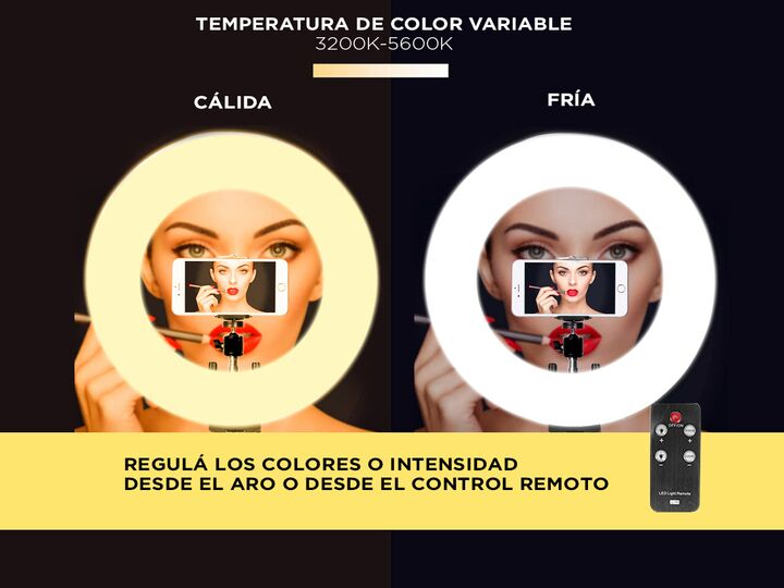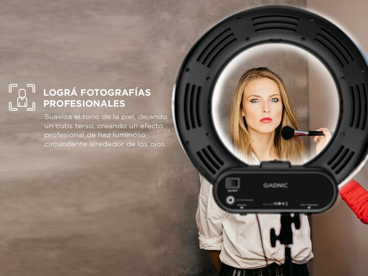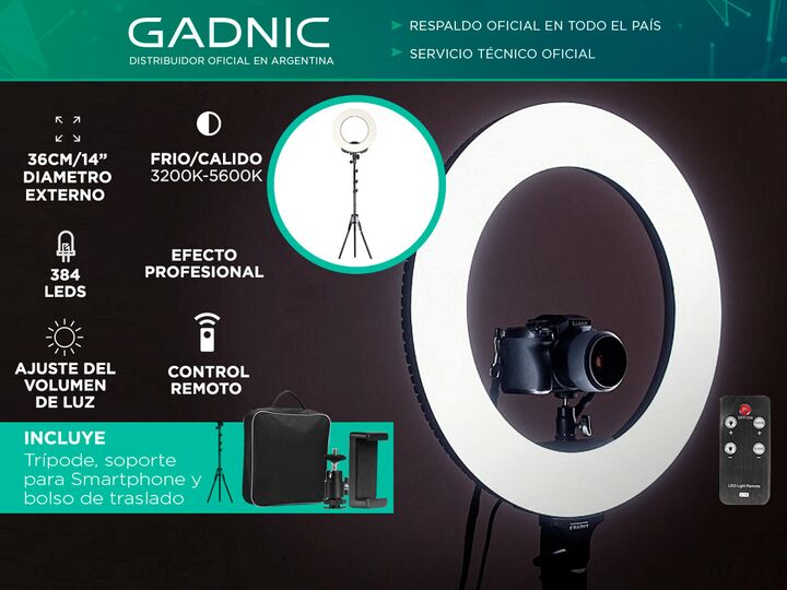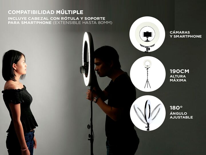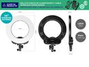 Iluminador Aro de luz Led Ø36cm LED Ring Light Modelo FOTO0003 + Columna de iluminación 190 cm + Soporte para Smartphone Recomendado para uso con smartphone en fotografía de retrato, maquillaje, peluquería, etc. Gracias a sus 384 leds, suaviza el tono de la piel dejando un cutis terso, creando un ef...