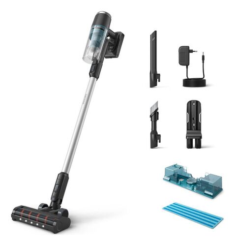 Limpieza 3 en 1: Aspira, Trapea y de Mano Sistema de Trapeado Aqua: Incluye un módulo magnético que permite aspirar y lavar el suelo simultáneamente, eliminando hasta el 99% de las bacterias con solo agua o detergente suave. Versatilidad Total: Se convierte fácilmente en una aspiradora de mano liger...