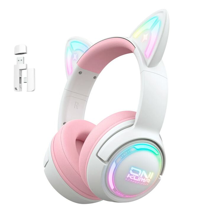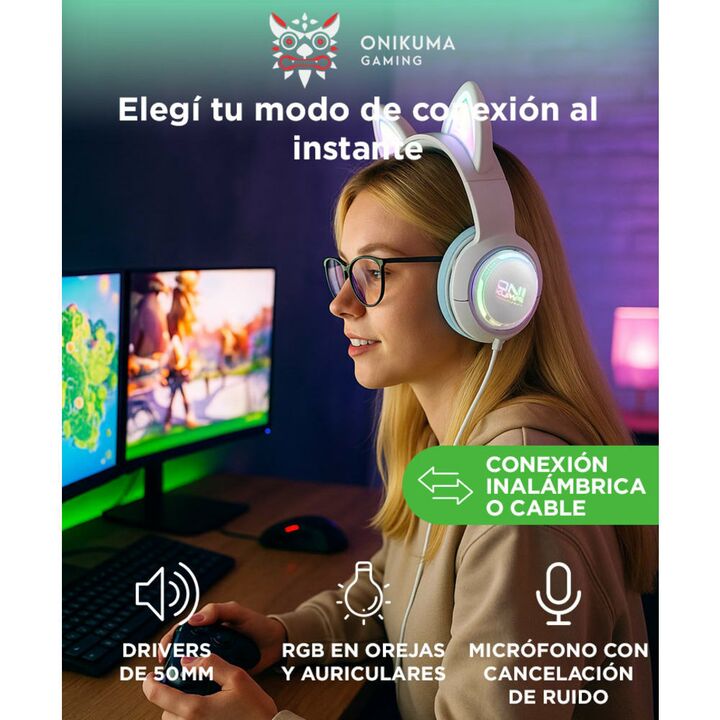 Conectividad 3 en 1: Bluetooth 5.3, inalámbrico 2.4 GHz y cable USB C para adaptarse a cualquier dispositivo. Conectalos a consolas, PC o móviles sin complicaciones. RGB y orejas de gato : Personalizá tu estilo gamer con luces LED llamativas y orejas de material respirable. Ideal para destacar en tu...