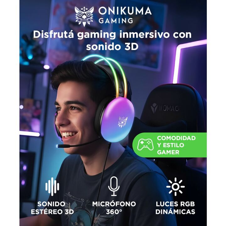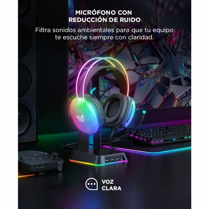 Explosión de luz y sonido en cada partida El OnikumaX25 RGB Gaming Headset transforma tu setup con luces LED de efecto respiración multicolor que crean una atmósfera inmersiva. Cada altavoz de 50?mm está afinado para ofrecer sonido estéreo 3D detallado: graves contundentes, tonos medios claros y agu...