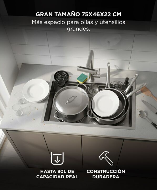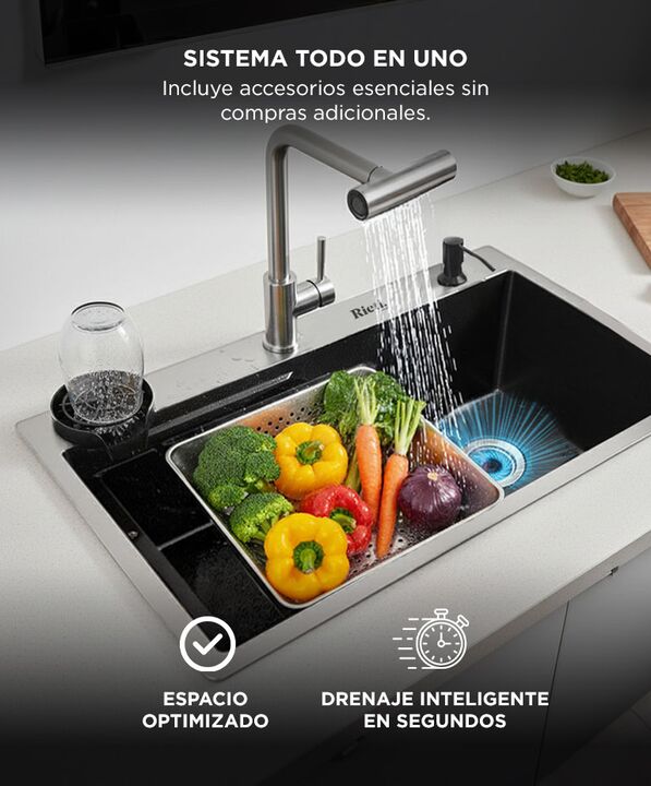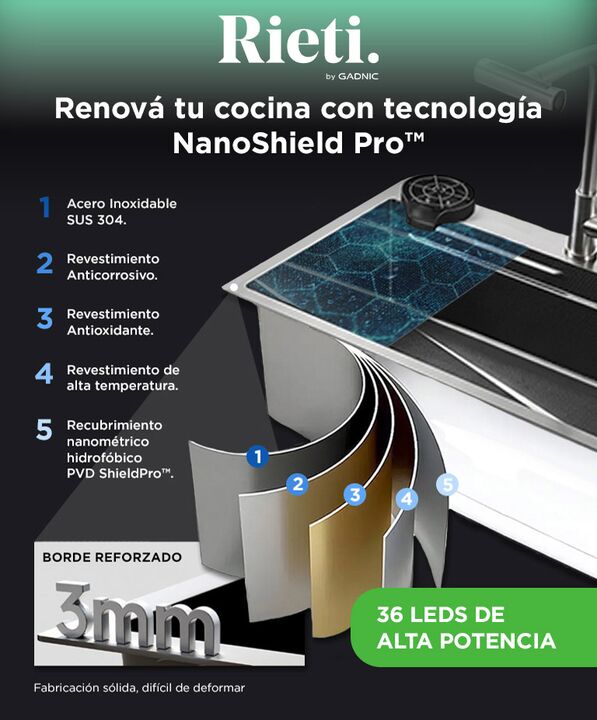 SUPERFICIE NANOSHIELD PRO El fregadero incorpora recubrimiento nanometrico PVD NanoShield Pro que protege el acero y mejora su durabilidad. Esta tecnologia crea una barrera que reduce marcas visibles y facilita la limpieza diaria. Su acabado mantiene la estetica moderna por mas tiempo. Es ideal para...