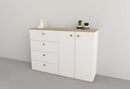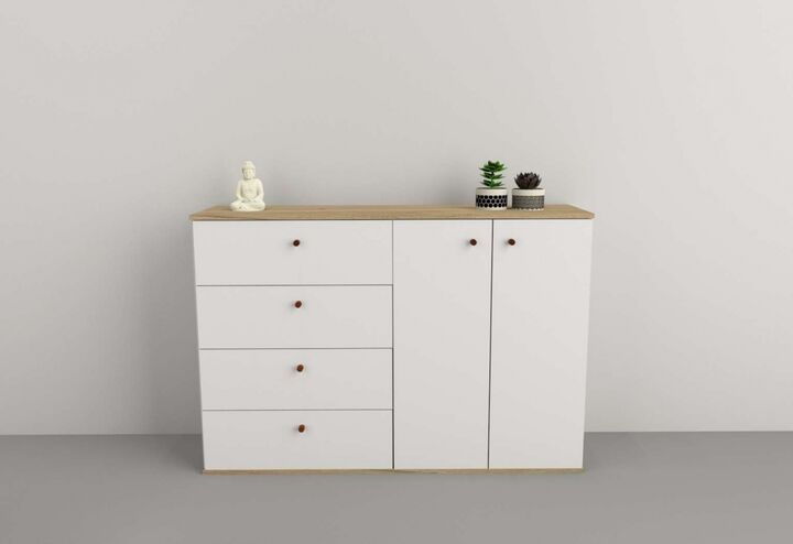 Medidas: Largo 1,29 m - Alto 0,90 m - Profundidad 0,38 m Cantidad de puertas: 2 Cantidad de estantes:1 Cantidad de cajones: 4 Tiradores Metálicos color Cobre Envejecido Sistema Minifix Bisagras metálicas Melamina de Alta Resistencia IMPORTANTE Los muebles salen embalados en caja con instructivo de a...
