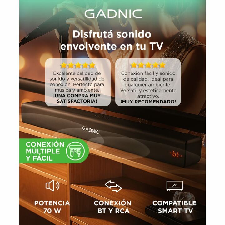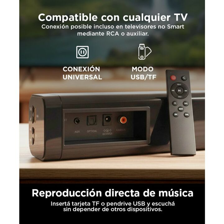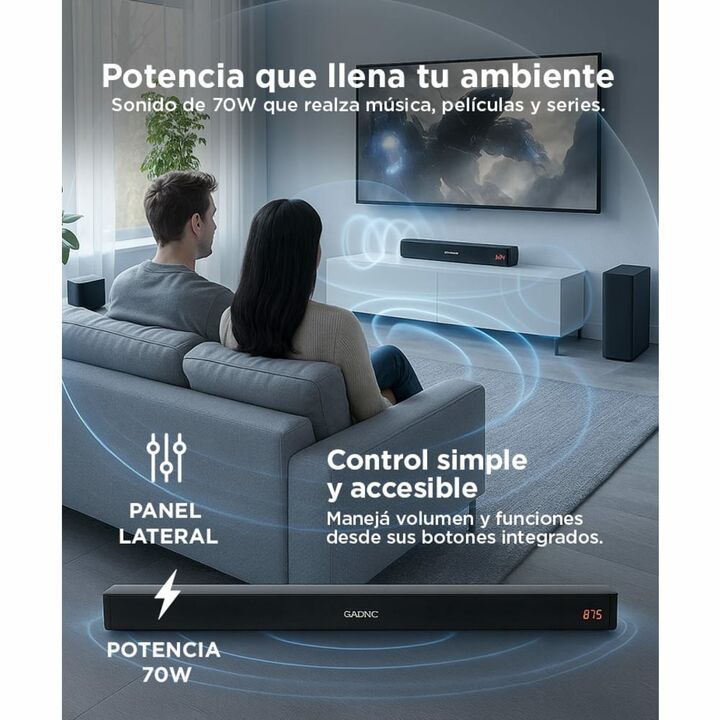 Disfruta tus tus partidos, series, películas, canciones favoritas con la Barra de Sonido BS900. Posee Bluetooth con un alcance de hasta 10 metros para que escuches lo que quieras desde tus dispositivos o desde la TV. Posee una Potencia de 70 Watts. Reproduce música des tu dispositivo con la función ...