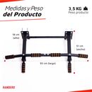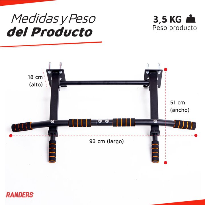 Barra para dominadas. • Hierro reforzado. • Grips antideslizantes • Peso máximo de usuario: 150kg. Datos logísticos: • EAN: 7797481914478 • Medidas del producto: 93 x 51 x 18 cm (LxWxH) • Peso del producto: 3.6 Kg • Medidas de la caja: 54 x 18.5 x 11 cm • Peso de la caja: 4 Kg