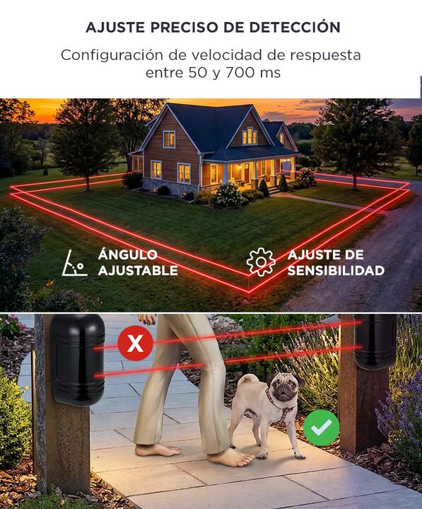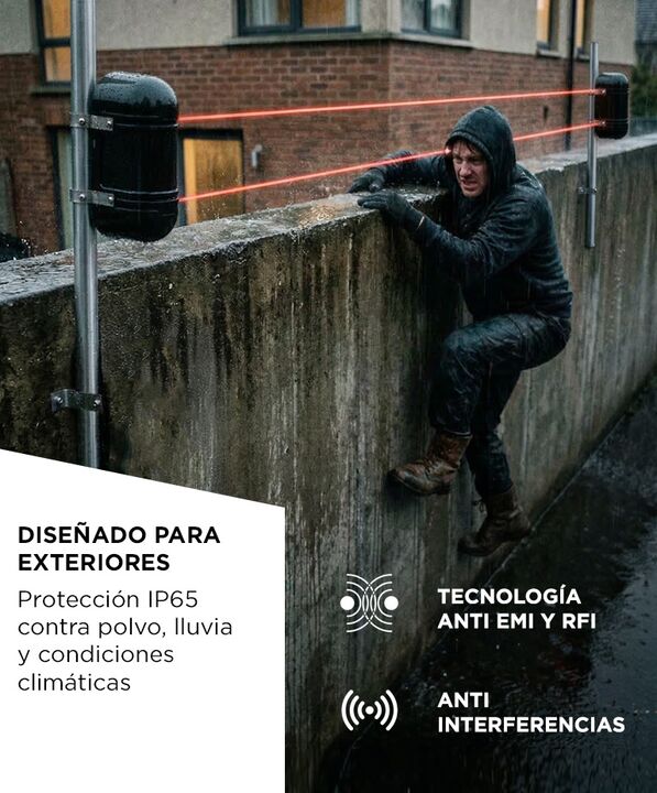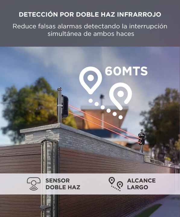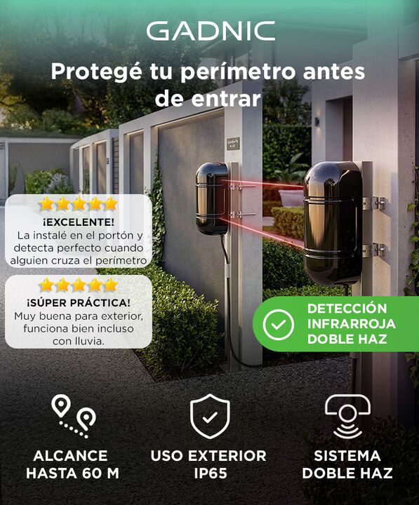 Detección perimetral precisa con doble haz infrarrojo La barrera infrarroja exterior GADNIC utiliza un sistema de doble haz que detecta la interrupción simultánea de ambos rayos. Este método reduce falsas alarmas y mejora la precisión en sistemas de seguridad perimetral. Alcance de detección ideal p...