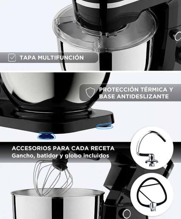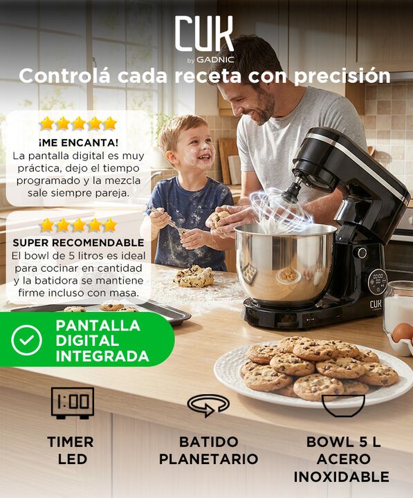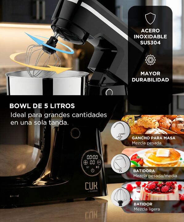 Pantalla digital con temporizador integrado: La Batidora Planetaria Digital CUK by Gadnic BATI021N permite controlar el tiempo de batido desde su display LED. Mejora la precisión y libera tiempo durante la preparación. Batido planetario para mezclas homogéneas: Su rotación planetaria recorre todo el...