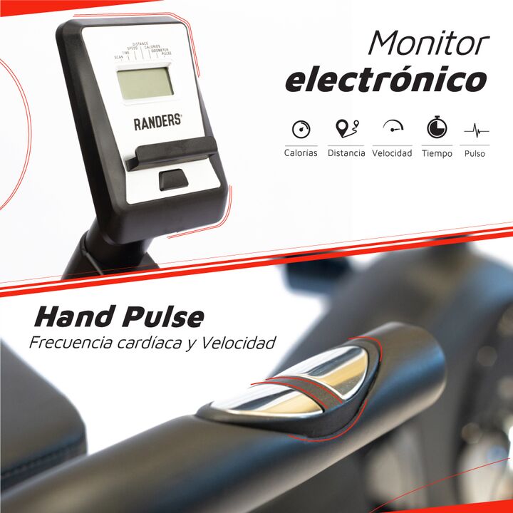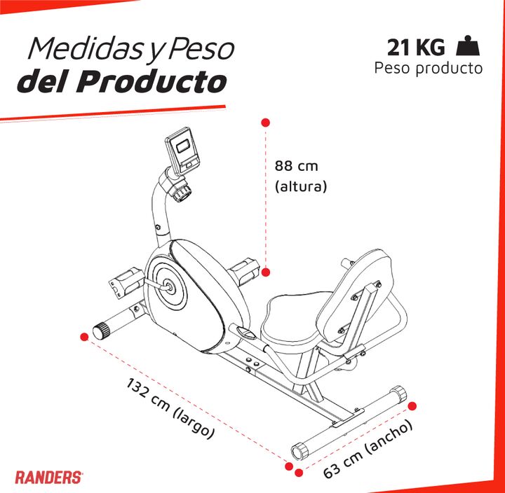 Bicicleta Horizontal Randers ARG-2534 CARACTERÍSTICAS PRINCIPALES o Tipo: Bicicleta Horizontal. o Resistencia: Magnética. o Peso Máximo: 100 Kg. o Disco de inercia: 3 Kg. o Asiento y manubrio regulables. o Monitor electrónico. o Funciones del monitor: Velocidad, distancia, pulso, tiempo y calorías. ...