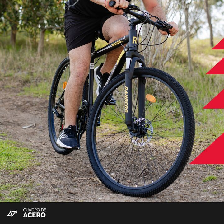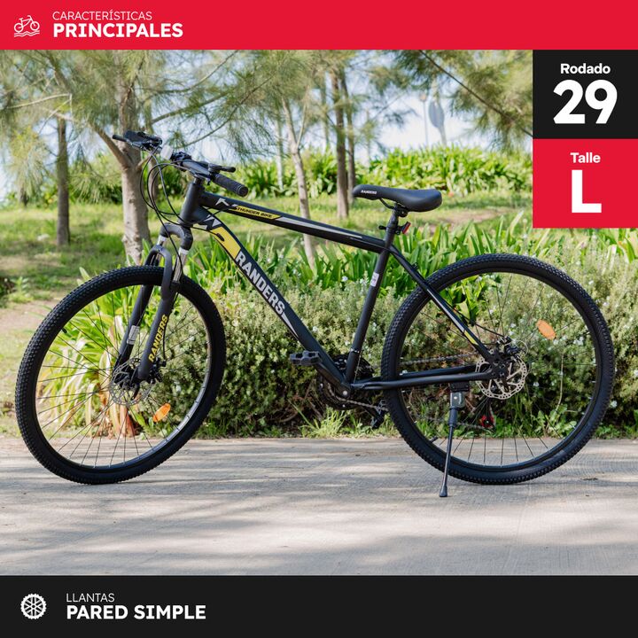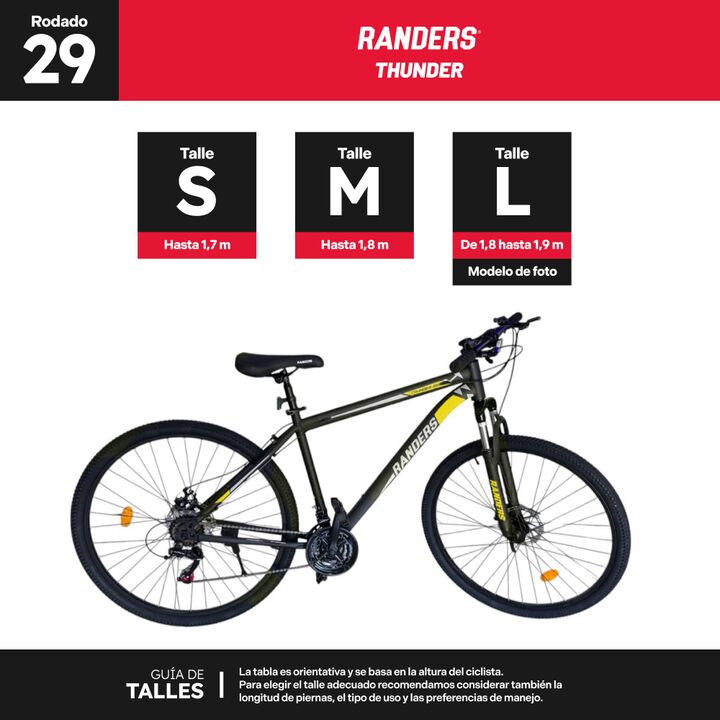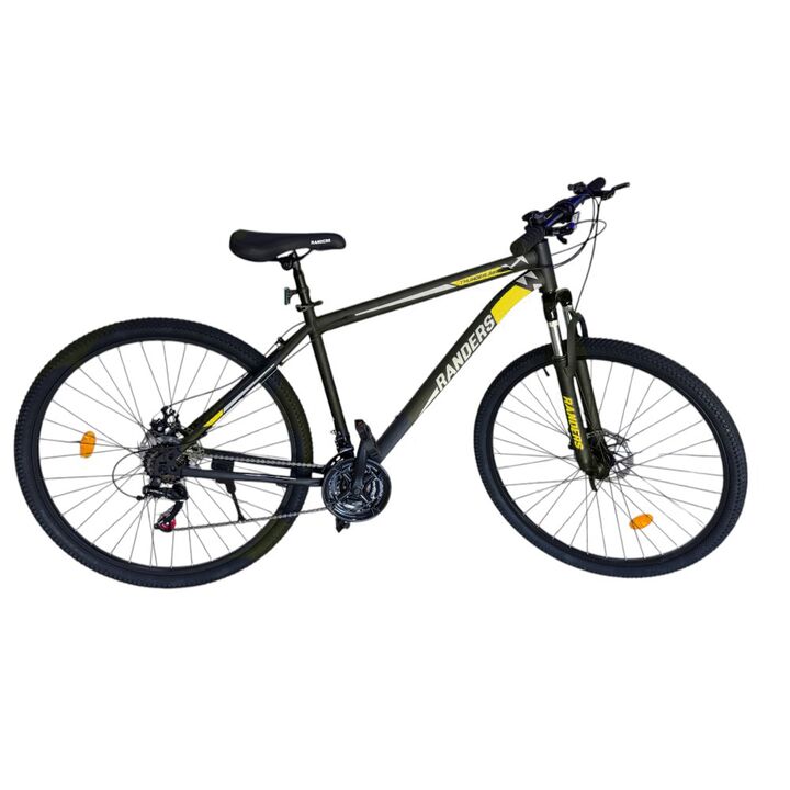 La Bici Thunder BKE-FE29-LB rodado 29 de Randers es una mountain bike confiable y lista para acompañarte en todo tipo de terrenos. Equipada con 21 velocidades Shimano TZ-500 y frenos a disco mecánicos, te brinda control y seguridad en cada salida. Su cuadro de acero resistente y la suspensión delant...