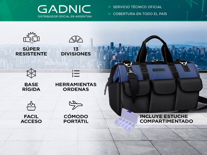 ¡Te presentamos el nuevo bolso de herramientas Gadnic! Este bolso de herramientas de alta calidad ha sido diseñado pensando en sus necesidades específicas. Sus 13 divisiones estratégicamente ubicadas le permiten llevar una amplia variedad de herramientas y accesorios de manera ordenada y accesible. ...