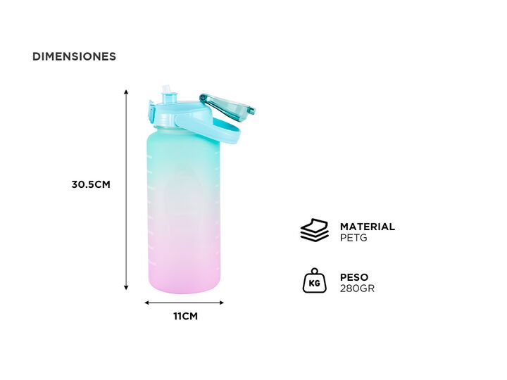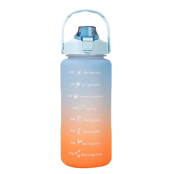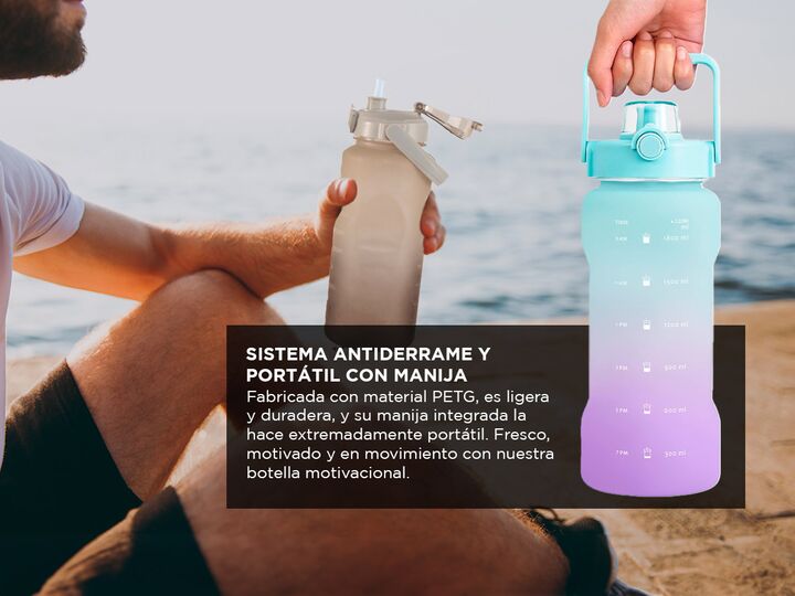 Descubrí la botella motivacional definitiva para mantenerte hidratado y motivado durante todo el día. Con un práctico pico con sorbete y un sistema antiderrame, esta botella de 2 litros es perfecta para llevar a cualquier lugar. Sus frases motivadoras y medidor de bebida te ayudarán a seguir tus obj...