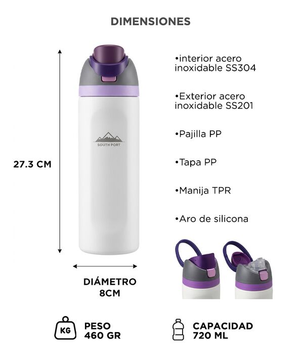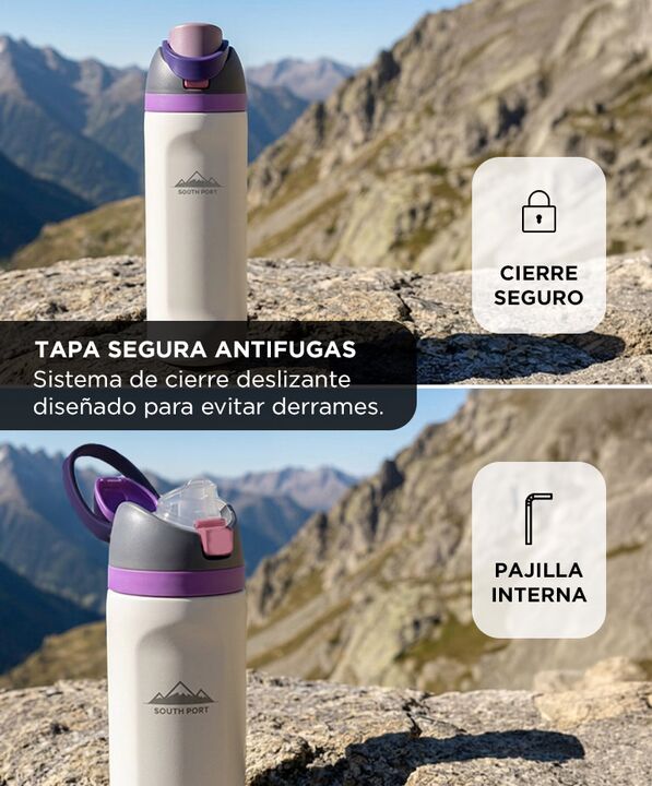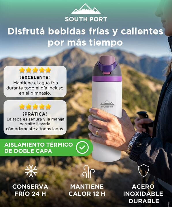 AISLAMIENTO TERMICO DE DOBLE CAPA La botella termica Southport by Gadnic esta diseñada con una estructura de doble capa de acero inoxidable que ayuda a conservar la temperatura de las bebidas durante largos periodos. Esto permite mantener agua fria o bebidas calientes segun la necesidad durante el d...