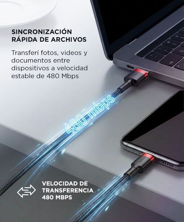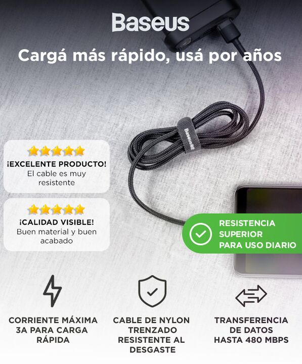 Durabilidad Y Resistencia Superior El cable Baseus USB A a Tipo C esta diseñado para ofrecer una larga vida util incluso con uso intensivo. Su recubrimiento de nylon trenzado brinda mayor resistencia frente a tirones y desgaste. Los conectores reforzados ayudan a evitar daños en las uniones. Esto lo...