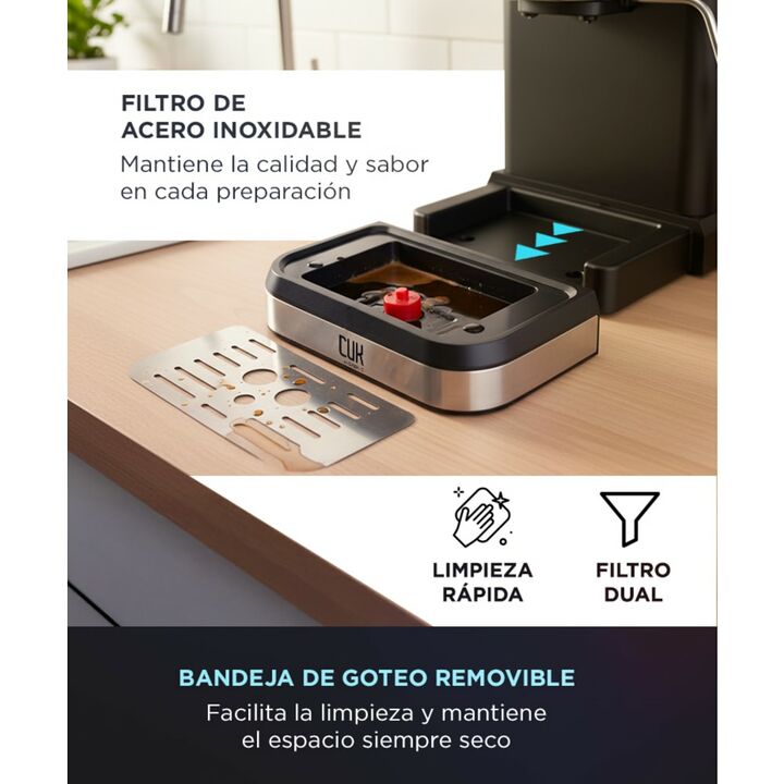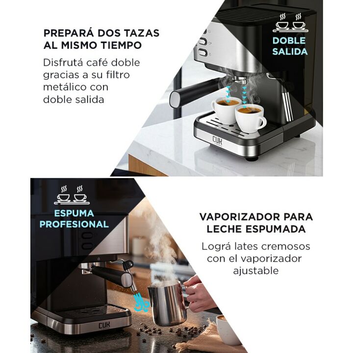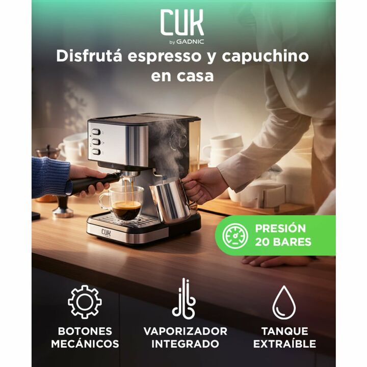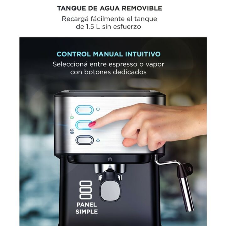 Espresso profesional en casa: Lográ bebidas de cafetería con 20 bares de presión constante y vaporizador para leche espumada. Tanque extraíble de 1.5 litros: Cargá y limpiá el depósito con comodidad. Ideal para varias tazas sin recargar. Panel mecánico intuitivo: Controlá espresso, vapor o agua cali...